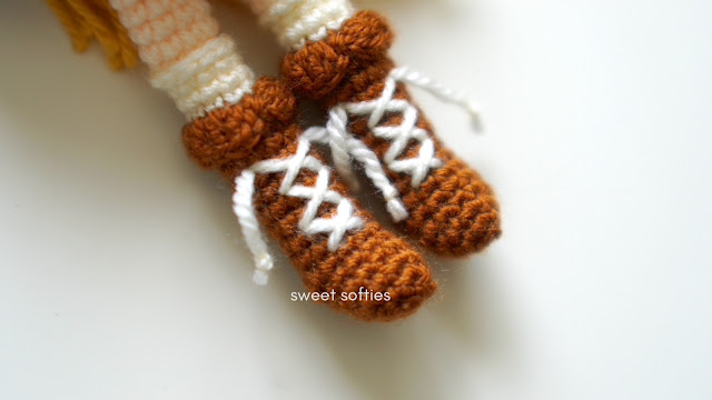 Oh, and here's a closer look at her boots. I have a thing for high boots with cross-strapped laces. It's also apparent in my Willow the Woodland Doll and Wanderlust Bunny patterns!