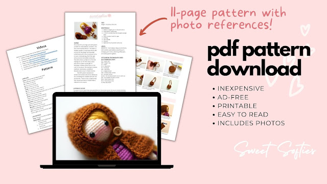 The full pattern instructions for crocheting Eliora from start to finish are available in the PDF pattern file! The PDF also includes photo references, a step-by-step hair tutorial, and links to helpful video tutorials relevant to this project. It is ad-free, easy-to-read, and helps support Sweet Softies.
